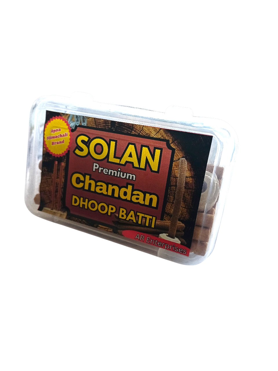 Solan Premium Chandan Dhoop Sticks for Pooja 9cm Long, Pack of (16 Dhoop Sticks), Natural & Long Lasting Home Fragrance. It is known to reduce stress, helps in calming, purify the air with anti-bacterial properties, and often uses natural ingredients like sandalwood powder and essential oils. A pure divine gift from AR Enterprises.